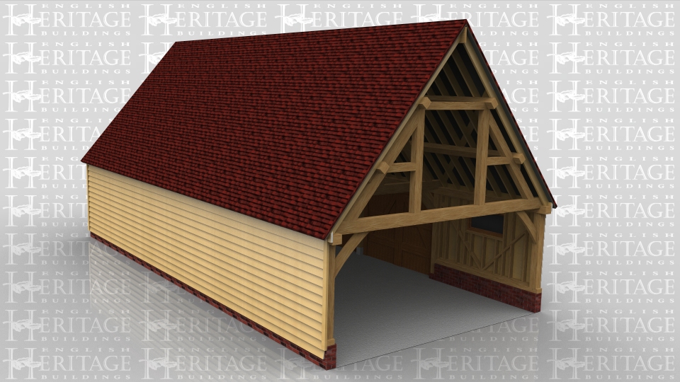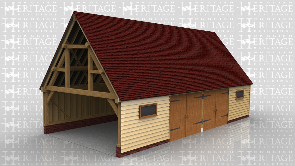This oak framed garage has two garage doors to the front and space on either side of the bays for storage. There are two windows to the front of the building and the left side is designed to be attached onto an existing building.