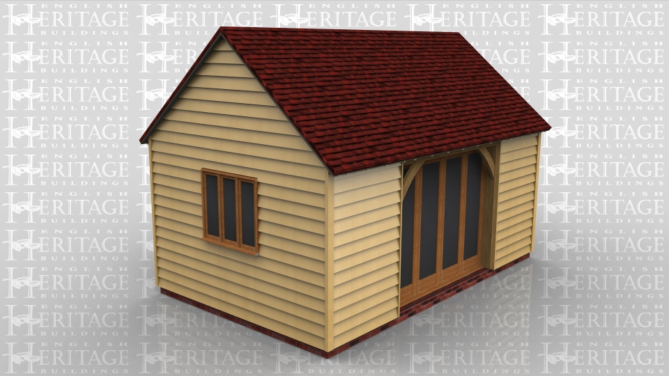 This home leisure building has full length opening windows to the front and a small enclosed store to the rear, which has trimming for a rooflight. The rear of the building has trimming for two rooflights and there is a three pane window to the side.