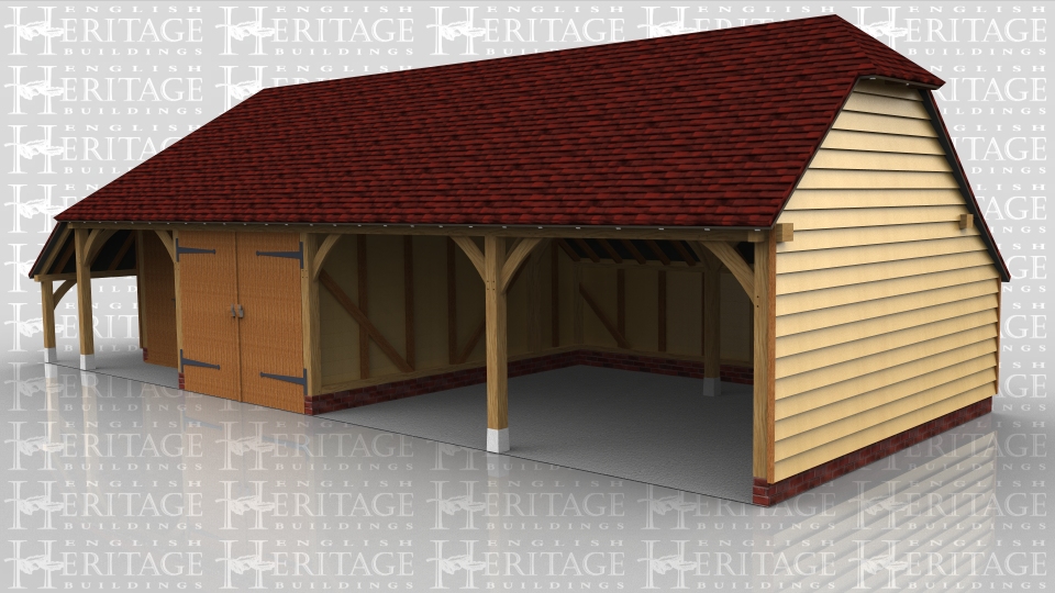 This oak framed garage complex is formed of four bays, two enclosed and two open. The enclosed bays are a small store with a single door to the front, and a garage with a set of garage doors. To the left is a logstore with the rear enclosed. To the rear of the open bays is an enclosed store.