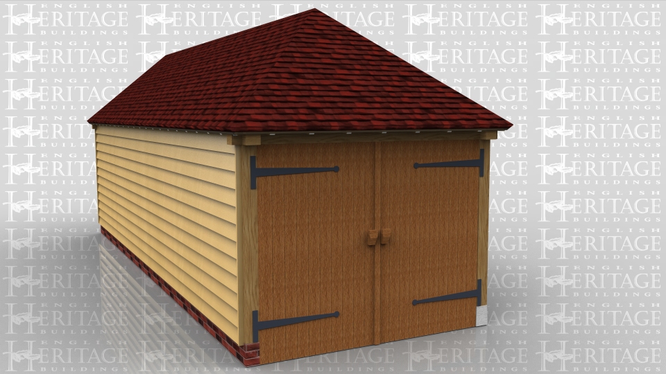 This oak frame home leisure building is fully glazed at the front and has an enclosed logstore. Access is via a set of garage doors to the left side, although there is also a single door on the right hand side.