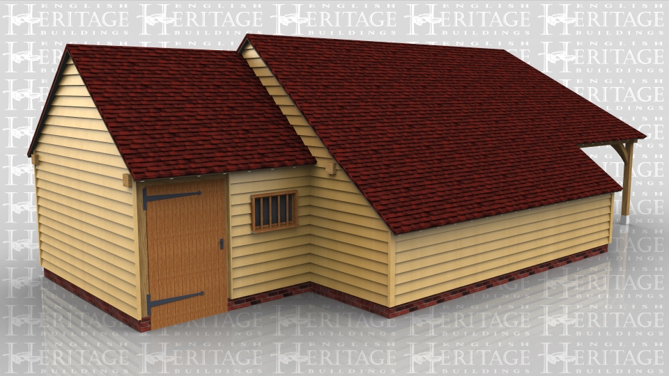 This oak framed garage is formed of two different frames. One is a three bay garage/car port with one bay open to the left side,front and rear. The other bays are open to the front. The other frame is a single enclosed bay, to be used as a store or workshop. Access is via a single solid door to the rear, and there is a mullion window to the front.