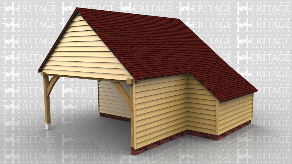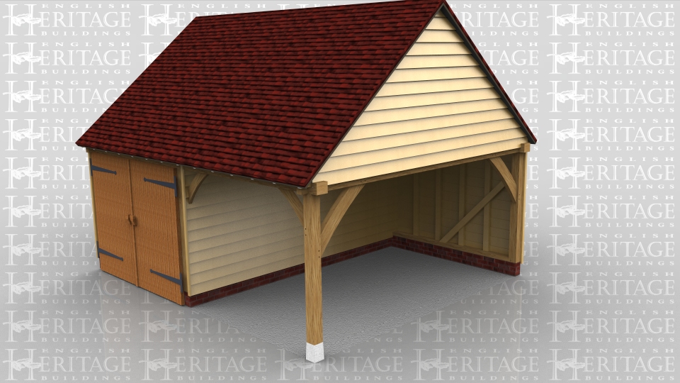 This oak framed two bay garage has one enclosed bay with garage doors and one open bay. The enclosed bay also has an enclosed logstore to the rear.