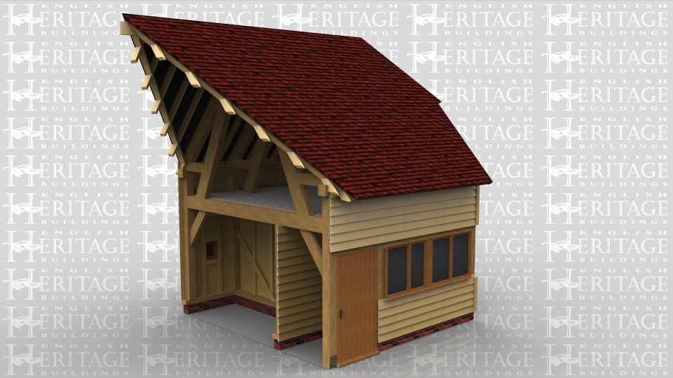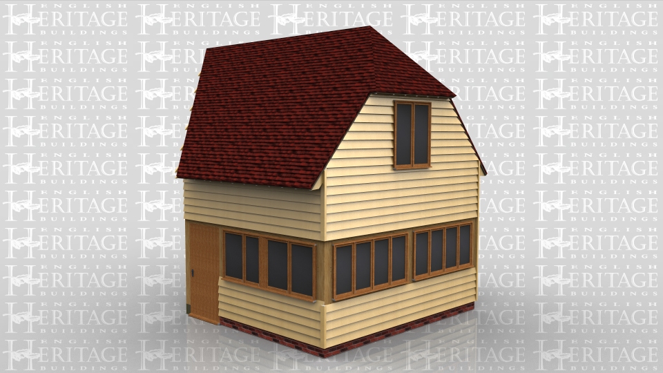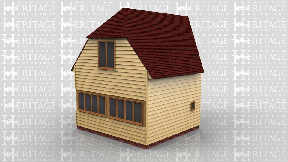 This two storey oak framed home extension is designed to be attached to an existing building. There are two sets of four pane windows to the left side of the building and a two pane window on the first floor. There is a single door for access at the rear and another two sets of two pane windows.