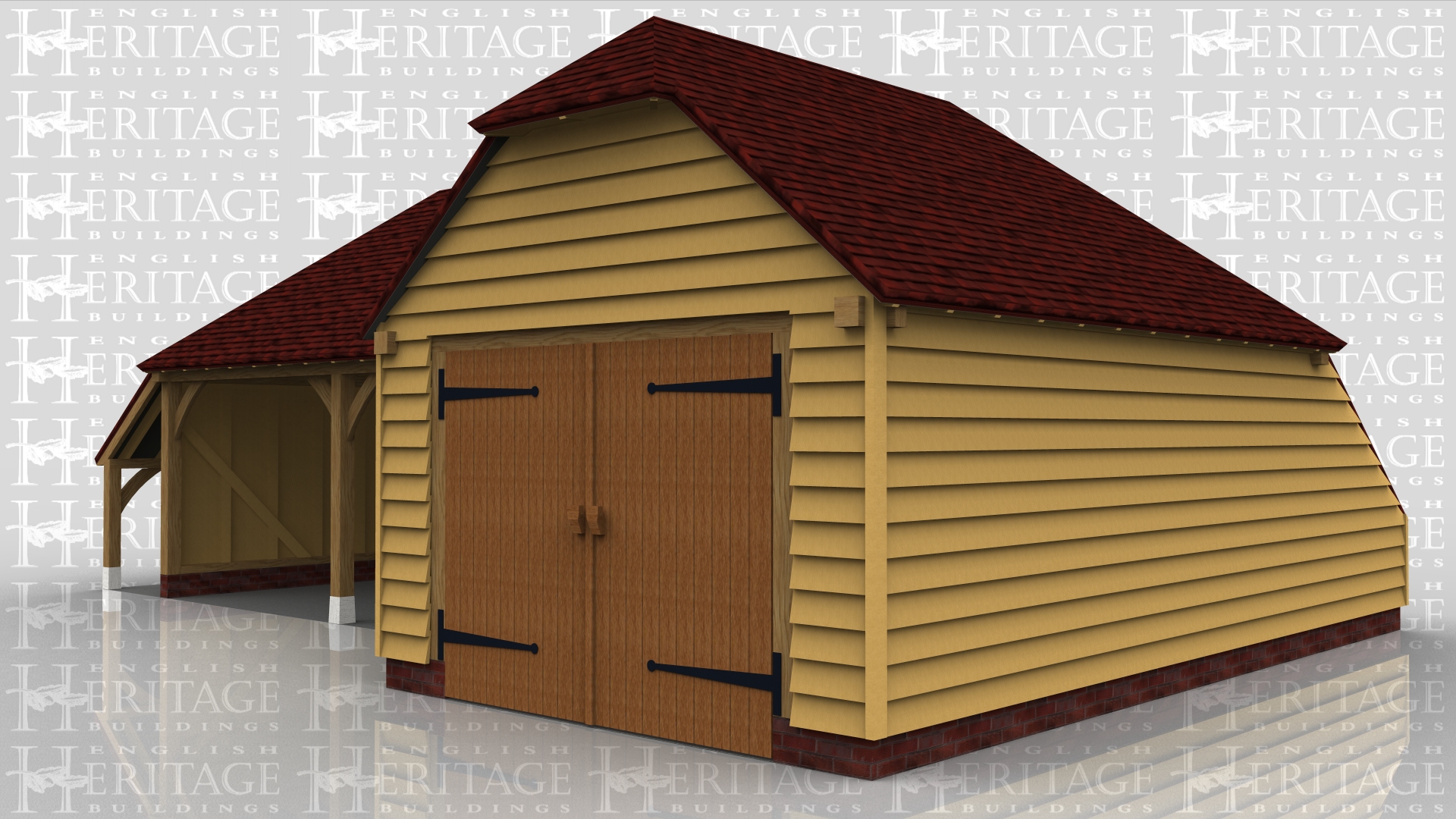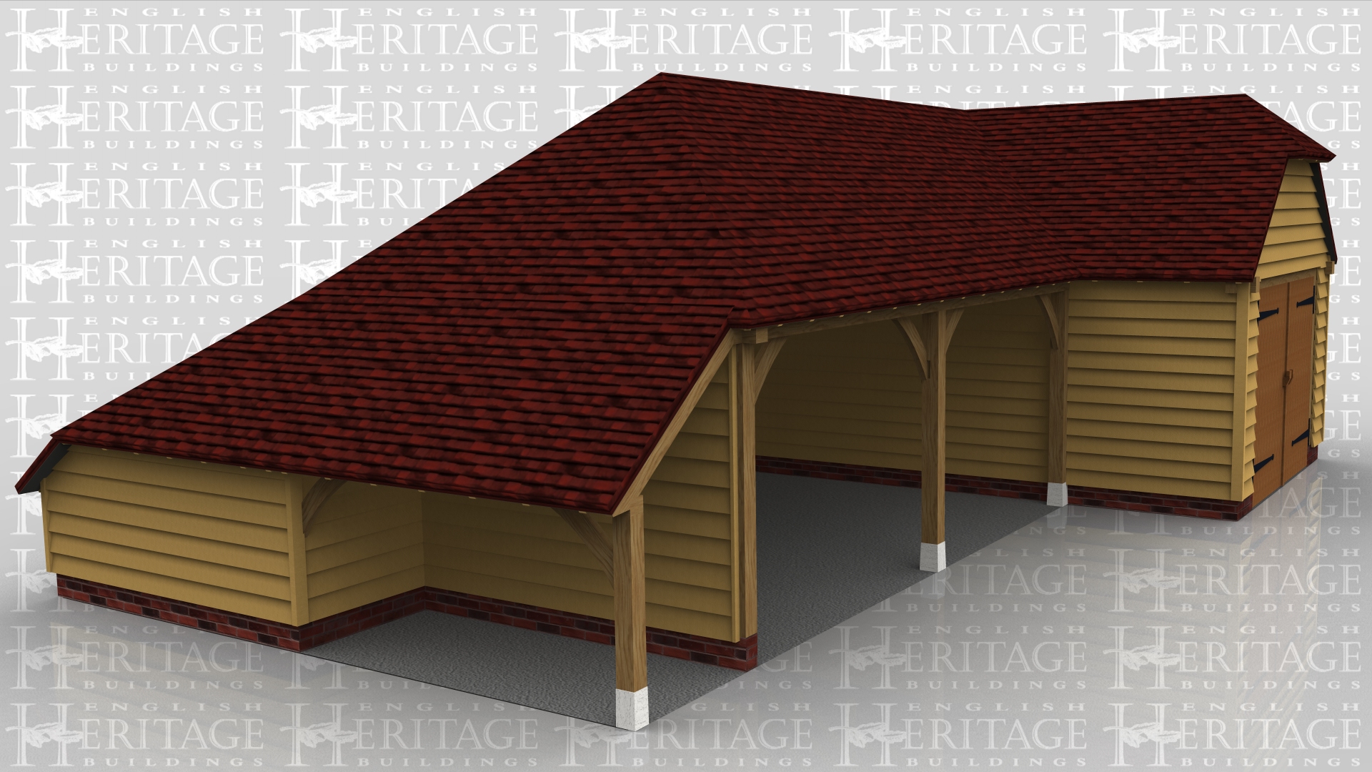 This oak framed garage complex is formed of two different frames. The first is a two bay open garage with an enclosed store to the left and rear. The second is a three bay enclosed garage with a set of garage doors to the left side and an enclosed store to the right.
