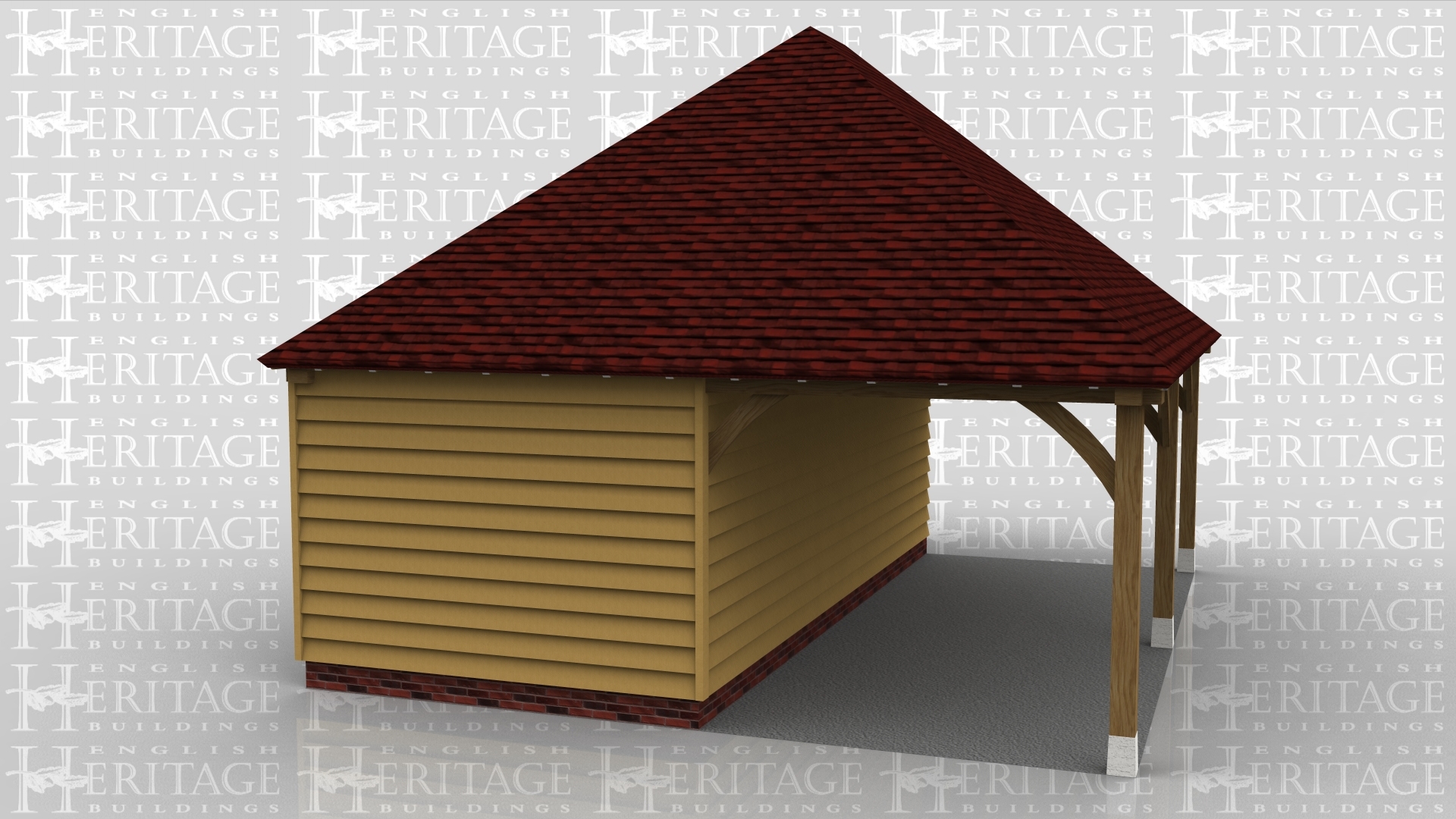 This oak framed garage is formed of two bays, one open and one enclosed. The enclosed bay has three sides and is open to the front, whereas the open bay has no rear, left or front walls.