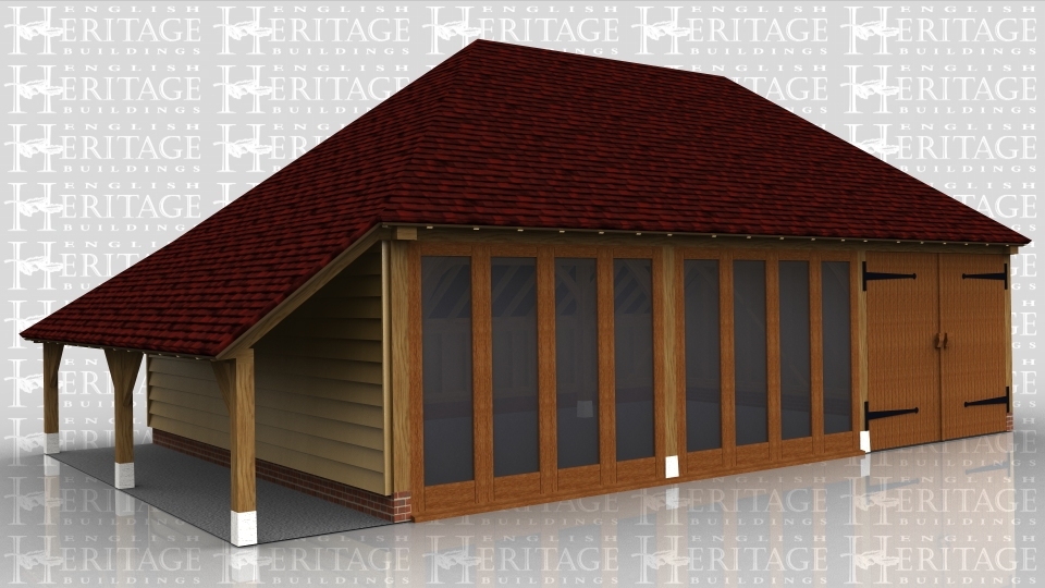 This oak framed garage complex is formed of three bays; one is a garage bay and the other two could be used as a workshop or home leisure building. The two enclosed bays are fully glazed to the front and have an open logstore to the left side. There is also an enclosed store to the rear.