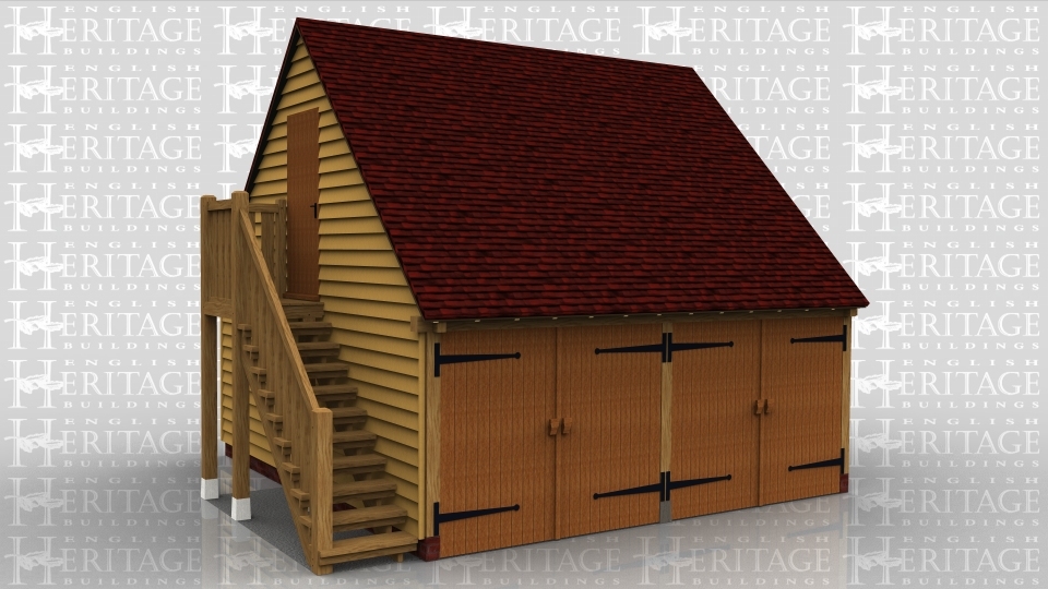 This oak framed two storey garage is formed of two enclosed bays, accessed via a set of garage doors to each. There is an external oak staircase to the left side and a solid single door to access the first floor.