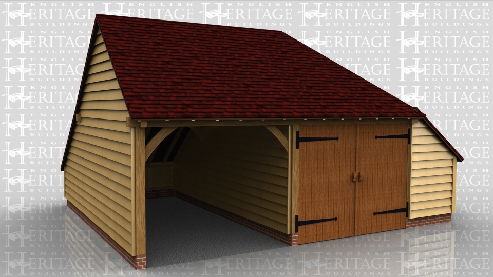 This oak framed garage is formed of two bays; one open and one enclosed. The enclosed bay is accessed via a set of garage doors to the front and has an enclosed store to the right side and the rear.