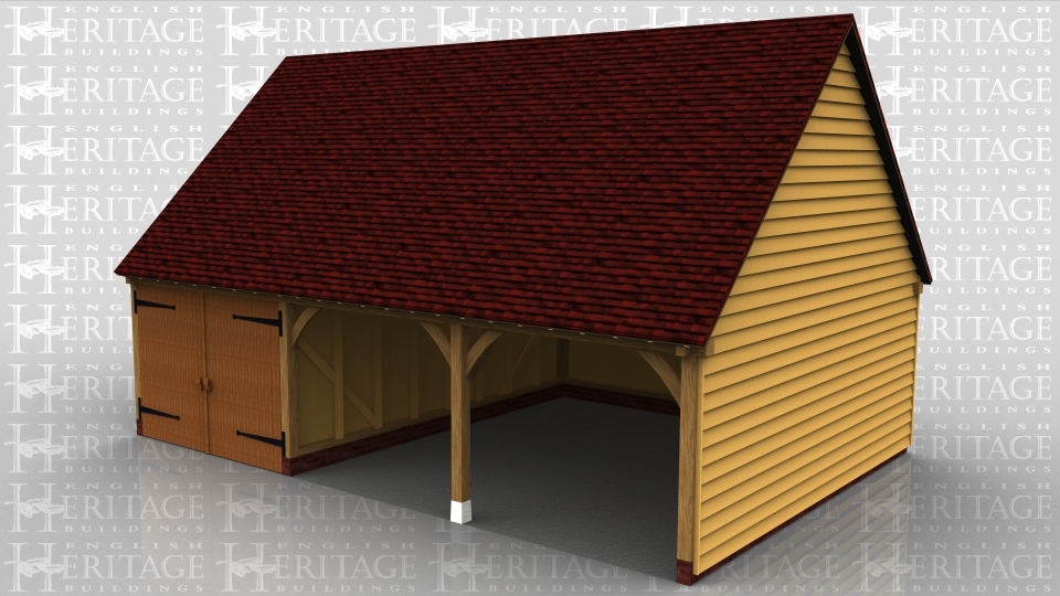 This oak framed garage is formed of three bays; one enclosed and two open. The enclosed bay is accessed via a set of garage doors to the front.