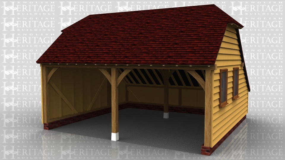 This oak framed two bay garage is open to the front. There is an enclosed store to the rear, and two large single pane windows to the right side.