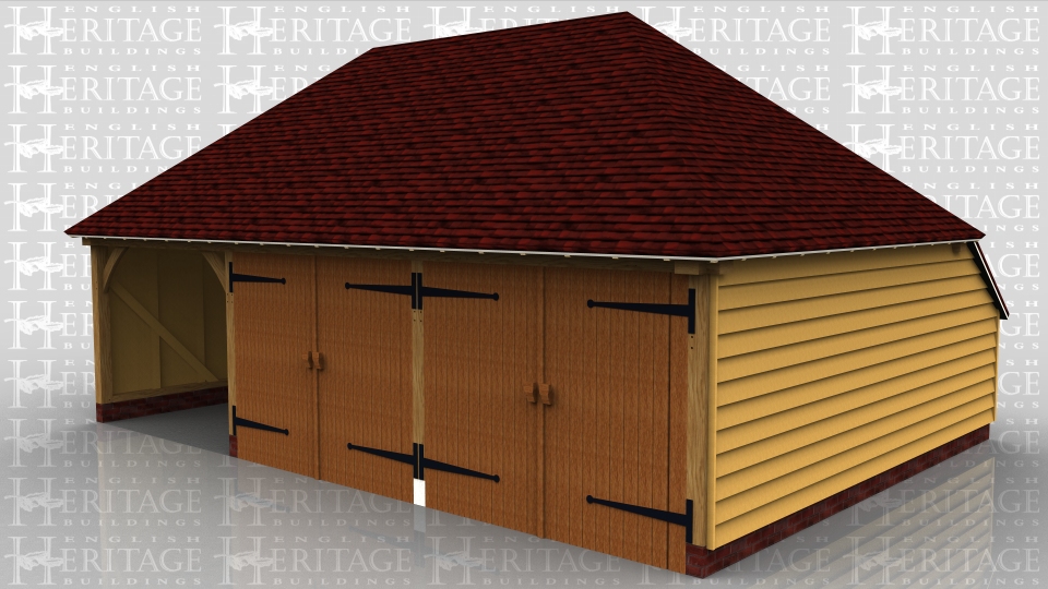 This is an oak framed three bay garage with two of the bays enclosed and secure with garage doors and the other bay is open. To the rear of the building there is an enclosed logstore.
