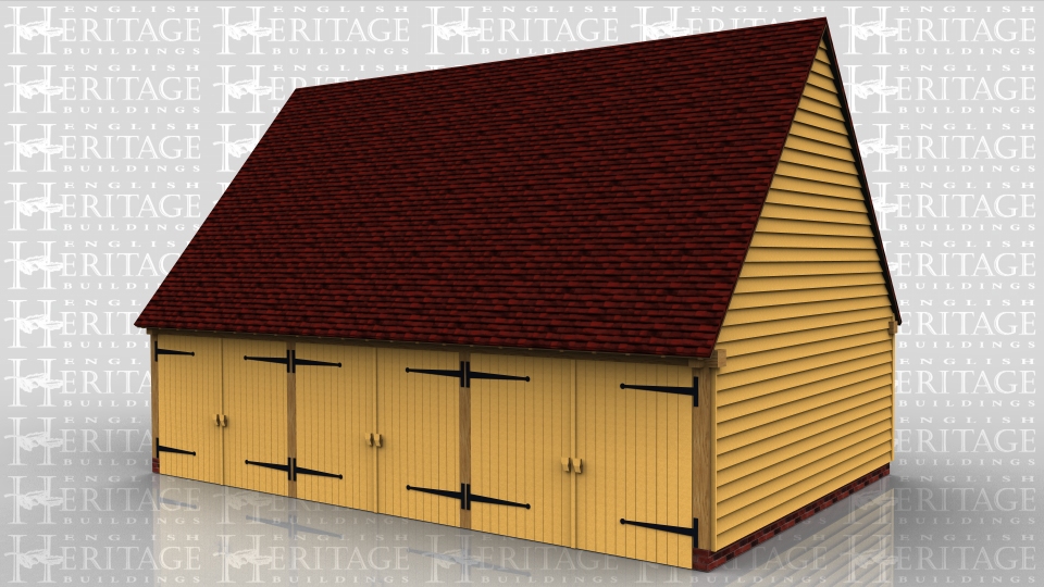 This oak framed garage has three enclosed bays with garage doors to the front and a half glazed door to the side.