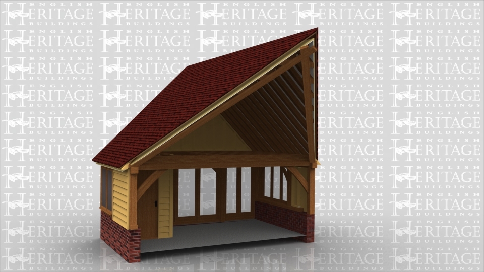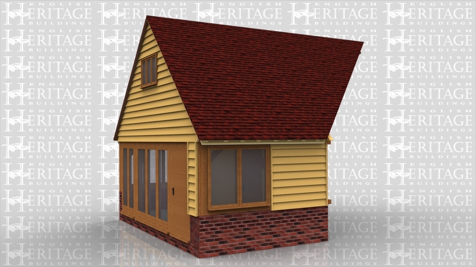 This oak framed building is designed to be attached to an exisiting building and has an upper floor. At the front of the building there is a three pane window at the top to bring in more natrual light to the upper floor. There is a single door and a three pane unit and a fully glazed two pane door. On the left hand side there is a three pane window and on the rigjht hand side there is a two pane window.