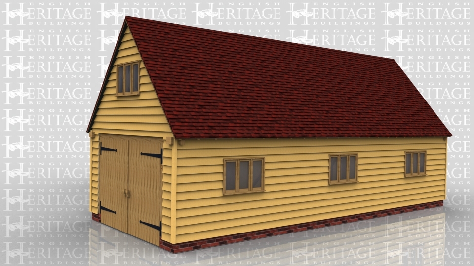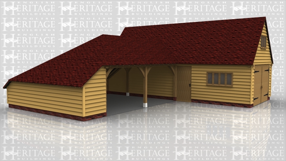 This oak framed complex is designed in an ‘L’ shape. There is a three bay garage with a garage door to the front and a three pane window to each bay and one on the first floor at the front. Attached to this is a two bay open garage with an enclosed catslide to the side.