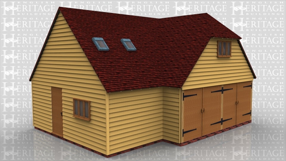 This oak framed building has two sets of garage doors at the front of the building. There is a single door for access and a three pane window on the left hand side. At the rear of the building there is a three pane window at the top and there is also a two pane window and a signle pane window. There is also seven rooflights, two at the front, three on the right handside, two at the rear of the building.