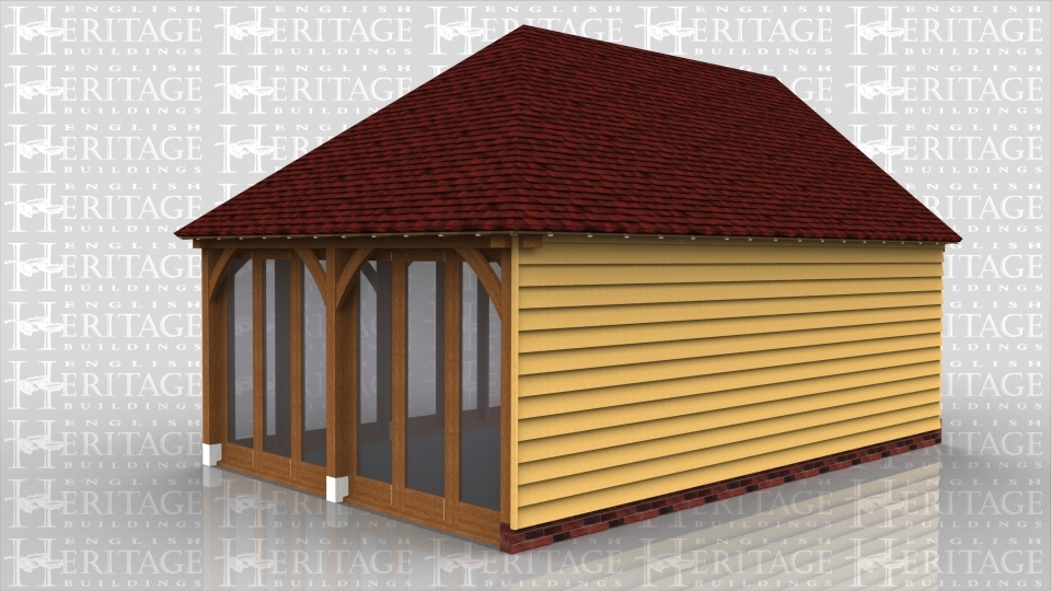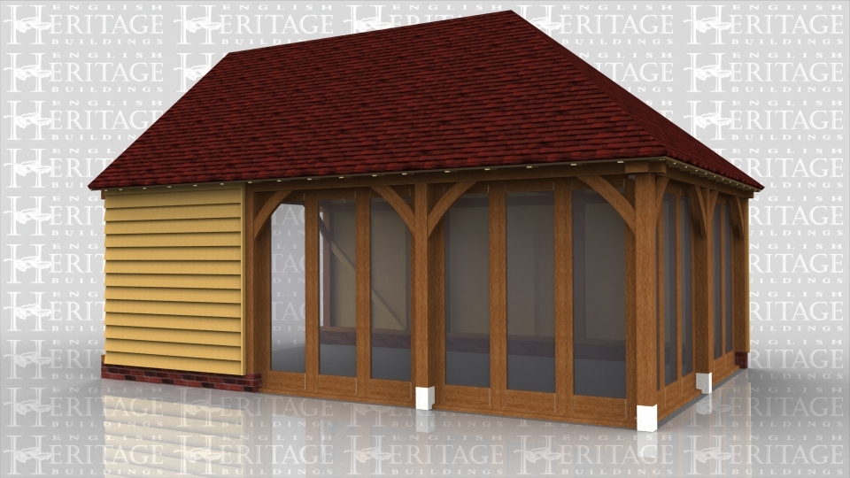 This oak framed building is designed to be attached to an existing building. At the front and right hand side of the building there are two fully glazed units.