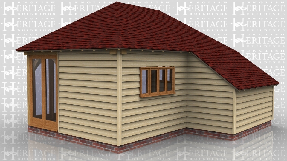 This is a two bay enclosed oak framed building accessed via two pairs of garden room doors at the front. There is an enclosed logstore to the rear along with a four pane window. The front of the building is fully glazed and there are two full length windows on the right hand side and a two pane window to the left.