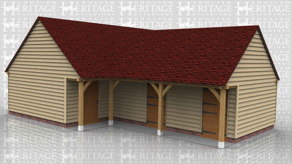 This is an oak framed equestrian building. On the left hand side are three garage bays which a secured with sets of garage doors and one of the bays can also be accessed via the single door at the other end of the bay. There are two other bay which are enclosed and are accessed via the the two equstrian doors at the front of the building.