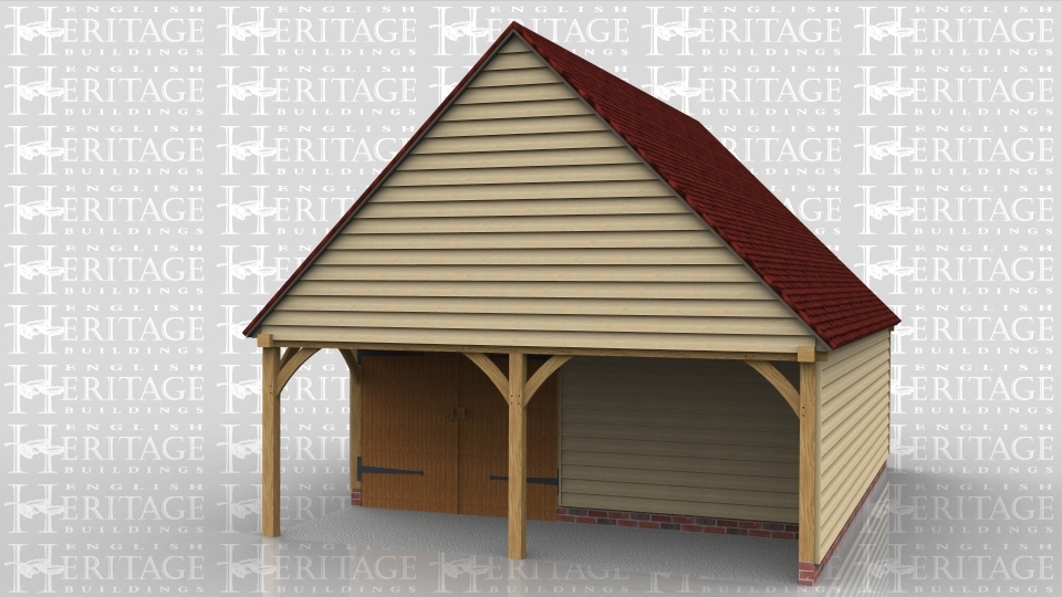 This is an oak framed two bay building with two sets of garage doors on the left hand side and one set of garage doors of the right hand side.