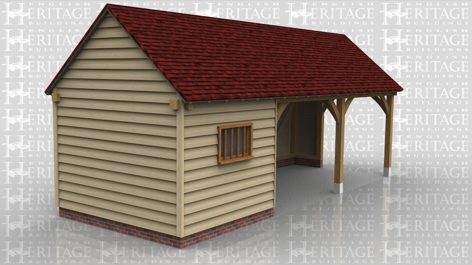 This oak framed building has three bays, one enclosed bay to be used as a store or workshop, and two open bays. The store is accessed via internal doors in the open bays. There are three full length windows on the right hand side.