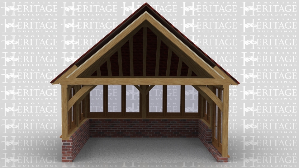 This is an oak framed building which is designed to be attached to an existing building. All three sides are glazed and all the glazing, apart from the two pane unit doors, sits on a dwarf cavity brick wall. There are also two rooflights: one at the front and one at the rear.