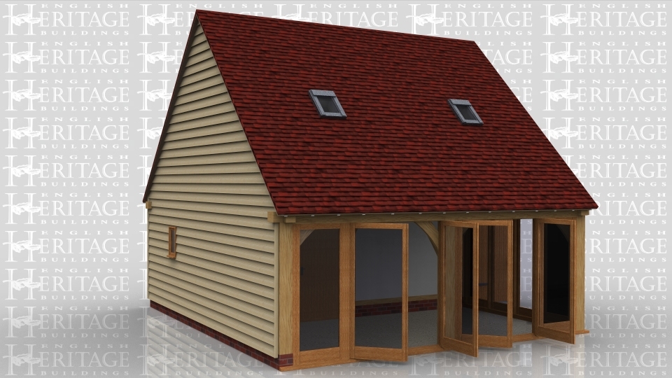 This is an oak framed building with an upper floor which shows how a leisure or work area can integrate with a more functional storage area. The front section is fully glazed on two sides with internal access into one rear section which would house the internal staircase, giving access to the upper floor. The other rear section is partitioned off as a storage area with external access via garage doors.
