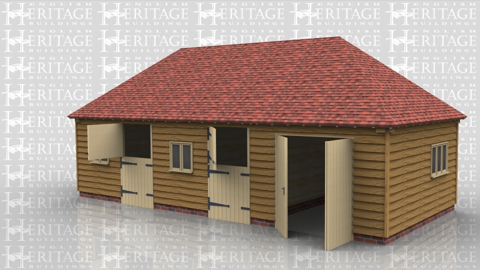 This is a three bay oak framed equestrian building.There are two stables with a two pane window to the right of the doors and the third bay is suitable for a tack room accessed via double doors.