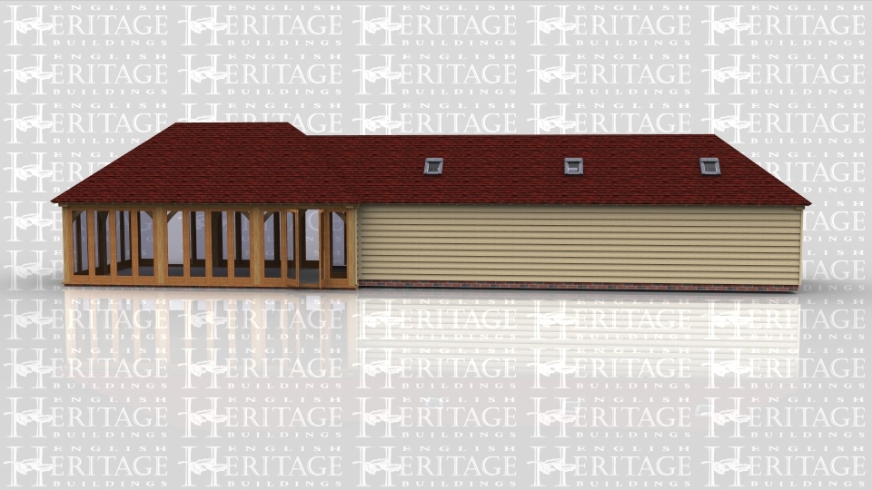 This is a six bay oak framed building. The three bays on the right hand side have full height glazing all round giving a fantastic open plan area with plenty of natural light – ideal for office or home leisure area. The three bays on the left are enclosed and divided into two separate areas with an internal partition with mullion windows to the front and rooflights at the front and rear of the building to give natural light.