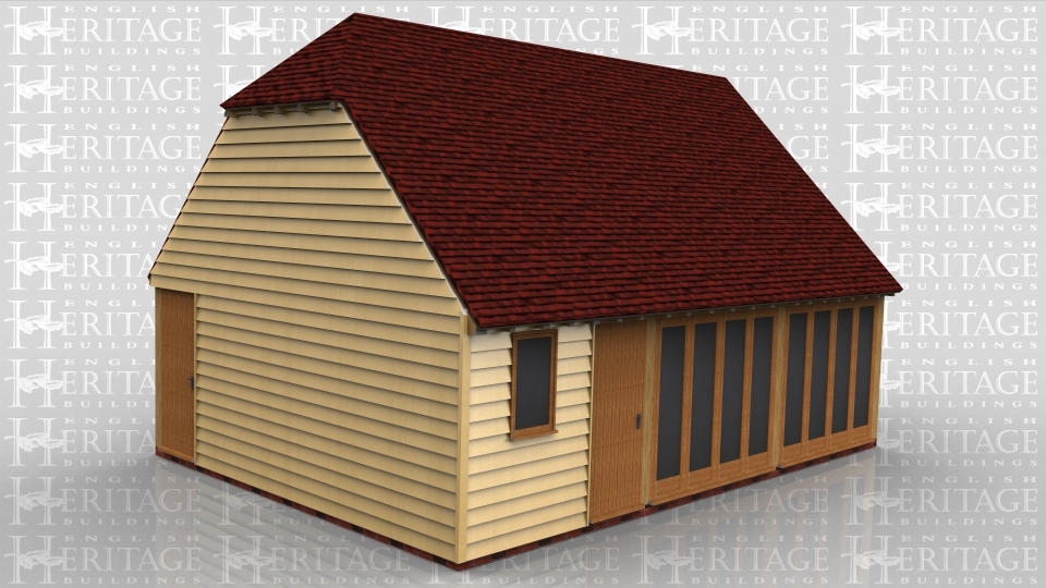 This is a three bay oak framed building with a steep enough pitch to give an upper floor area if needed. At the front there are two sets of four pane full height glazed units which open out as doors. There is a single door and a single pane window. There is also a single door on the left hand side and a two pane window on the right hand side. There is one rooflight at the front of the building and a barn hip on the left hand side.