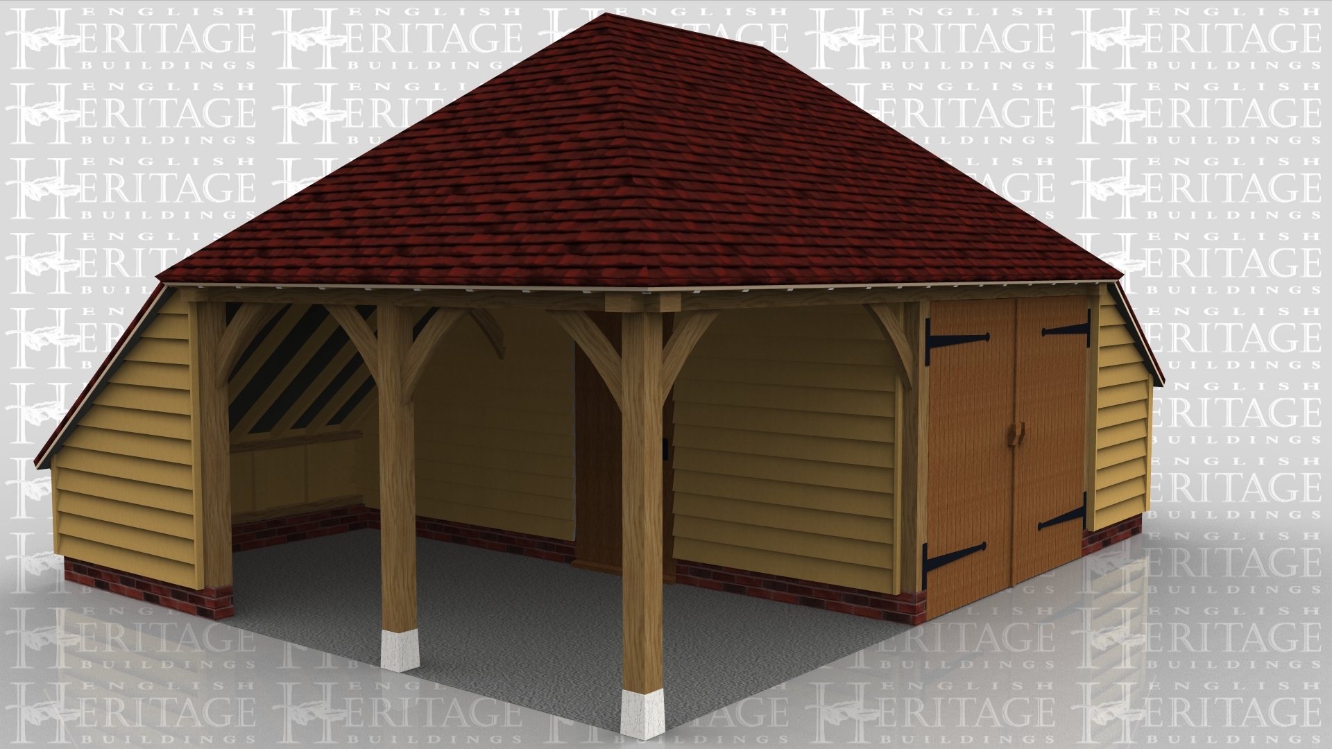 This is a two bay oak framed building with one enclosed garage bay and one open bay. There is an enclosed logstore on the right side and trimming for one rooflight.