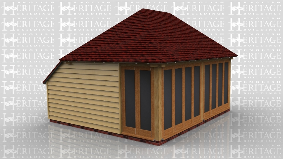 This is an oak framed building. At the front there are two sets of glazed french doors. There is also a set of french doors on the left hand side and there is a three pane unit on the right hand side.