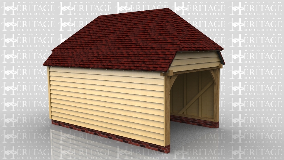 This oak framed building is a one bay garage with an open front and the rest enclosed.