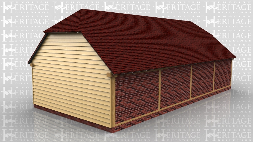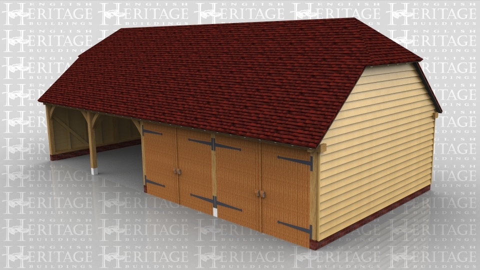 This oak framed building is a four bay garage, with two bays open and two bays enclosed. The enclosed bays are secured with standard garage doors.