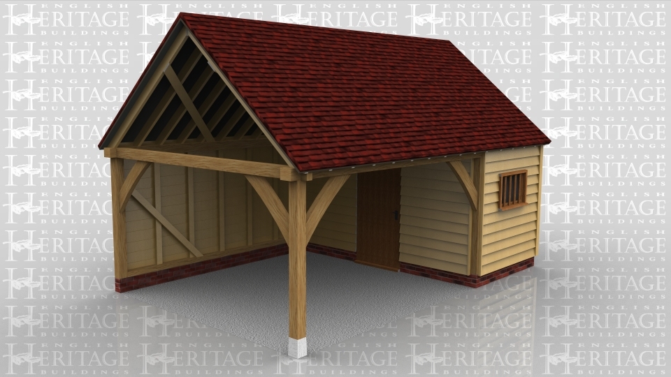 This oak framed two bay garage is formed of one open bay and one enclosed. The enclosed bay is accessed by a single solid door to the left and has a mullion window to the front.