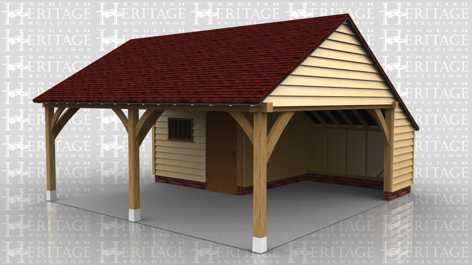 This oak framed garage is formed of two bays; one open and one enclosed. The enclosed bay has a set back partition to form a porch effect, and is accessed by a single solid door and a mullion window. There is an enclosed store to the rear of the building.