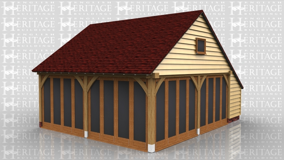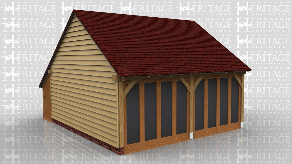 This oak framed home leisure building has two bays and an enclosed store to the rear, accessed via a single door. To the front of the building, both bays have full length opening garden room windows. The right side of the building is also fully glazed with these windows and has a single circular window to the first floor.