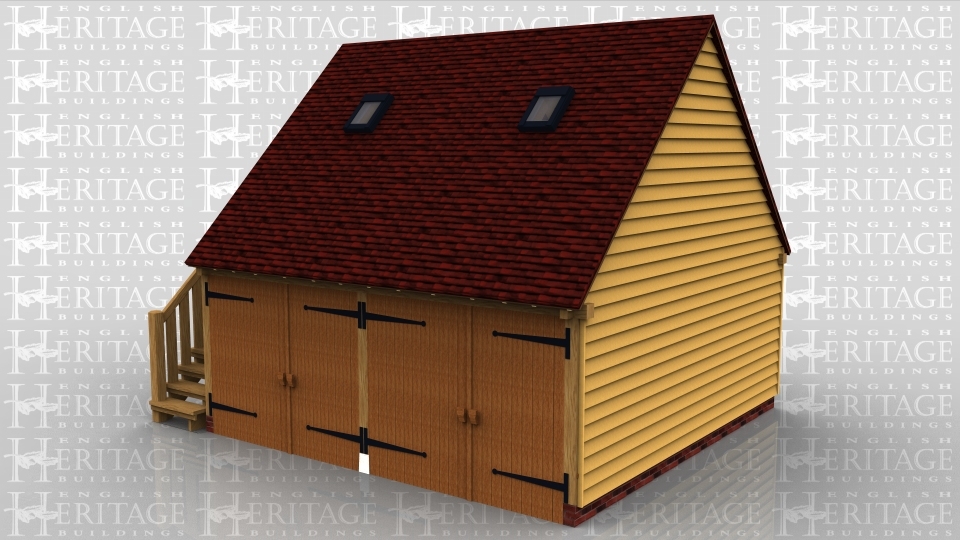 This two storey oak framed garage is formed of two enclosed bays, each accessed by a set of garage doors. The first floor is reached by an external oak staircase and a single door. There are trimmings for two rooflights.