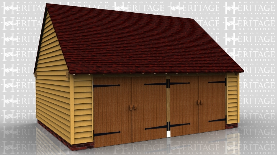 This oak framed garage is formed of two enclosed bays, accessed by two sets of garage doors to the front. There is a single door to the right side, as well as a three pane window.