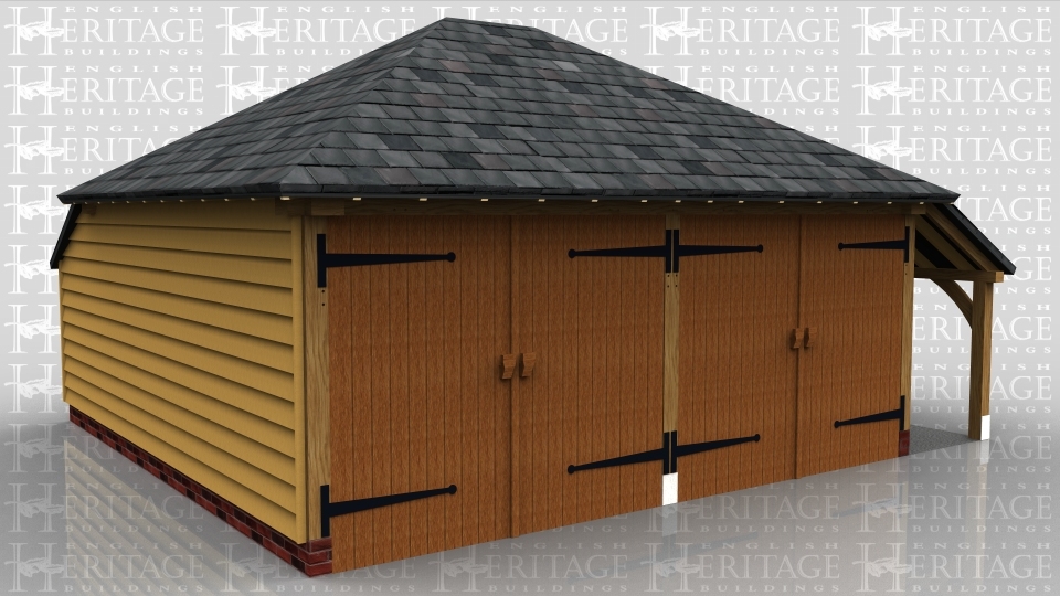 This oak framed garage has two enclosed bays accessed via standard garage doors to the front. It also has an open store to the the right.