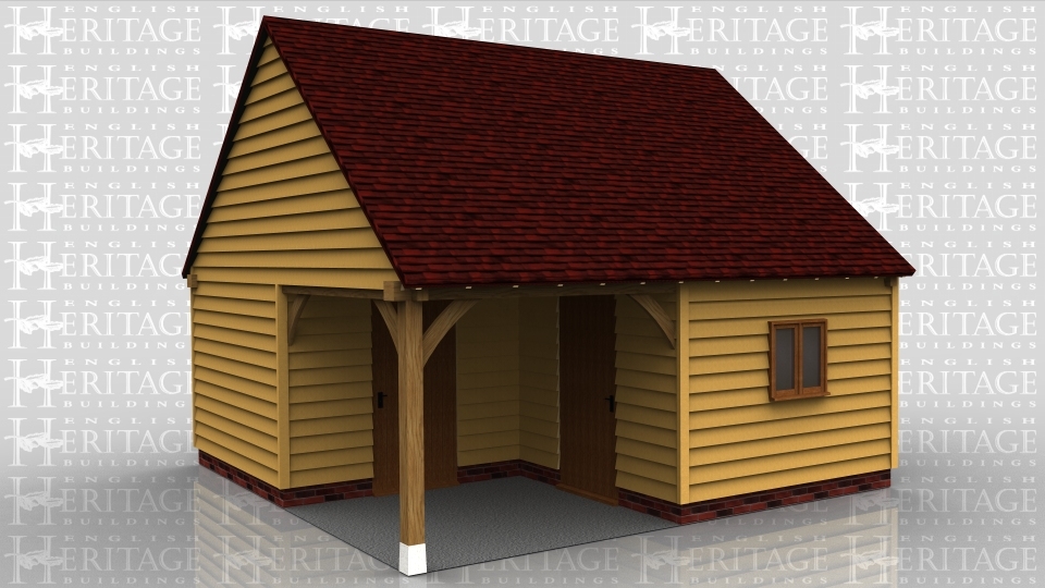 This oak framed garage has one open garage bay to the left hand side and one enclosed bay. The enclosed bay is accessed via a set of garage doors to the rear and has a two pane window to the front.