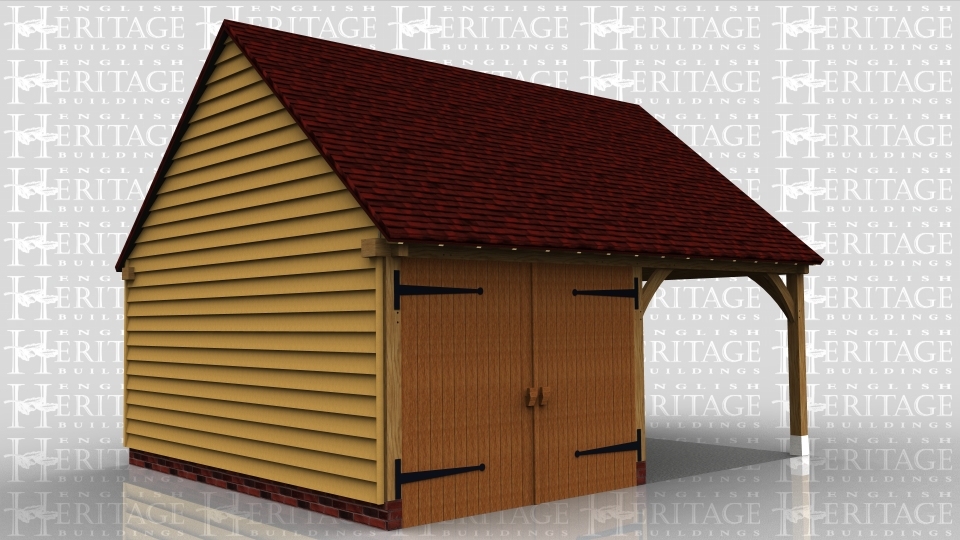 This oak framed garage has two bays, one is enclosed and accessed via a garage door to the front, and the other is open. There is a single circular window to the first floor on the right hand side.