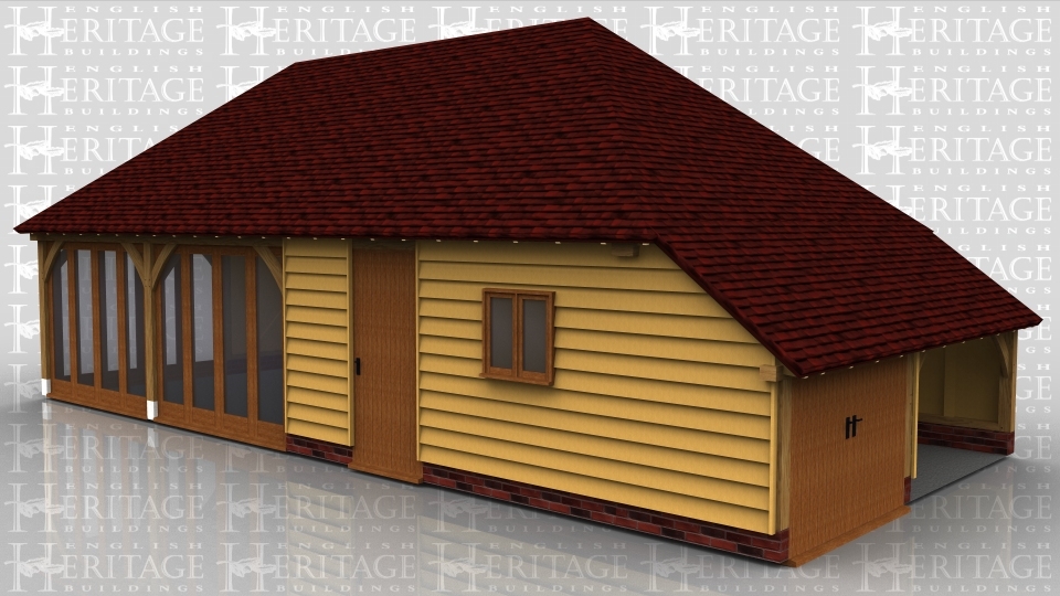 This oak framed home leisure building has two bays with full length opening garden room windows to the front and left side, and two enclosed bays to function as a store or workshop. The store is accessed via a single door to the front of the building and has a two pane window to the front, as well as an enclosed logstore to the right side.