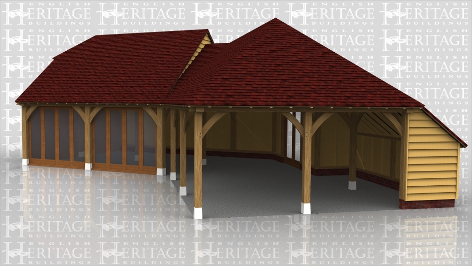 An oak framed building in a dog-leg shape with one section open with 2 bays for parking whilst the other end enclosed with two large doors, full height glazing along one side and an upper floor area accessed via an internal staircase.
