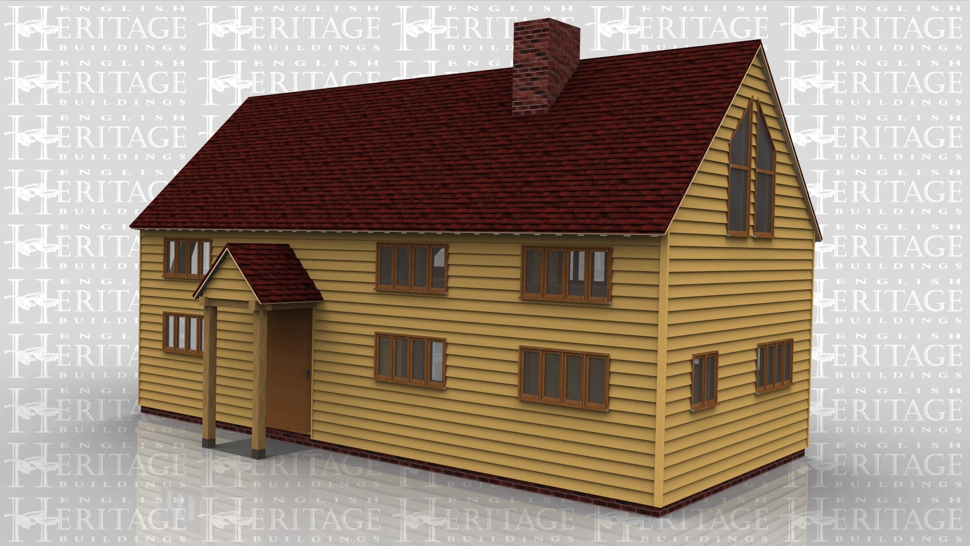A large oak framed house extension with sling braces and a top floor. There’s single windows as well as some full height glazing on the top floor to allow as much natural light into the house. A small porch is attachted to the front door and a chimney to create a nice family home.