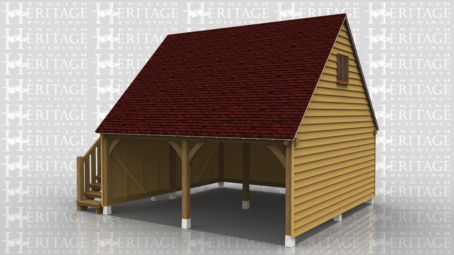 A 2 bay oak framed garage with an upper floor, The front of the building is left open while on the left side is a staircase allow access to the first floor. There is a solid single door in the left gable end and aon the right hand side there is a 3 light window.