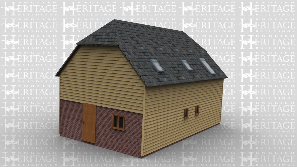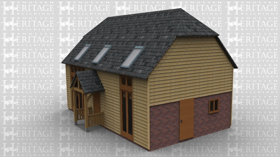 An oak framed house with full height glazing. Doors are situated on the front of the building and either end, with a porch attached to the front door. On the first floor roof lighting is used.