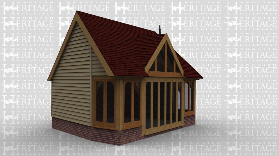 A oak framed garden room / summer house with the exterior having full height glazing , also has a feature glazed gable to front with leaded finial, to allow mazimum sunlight.