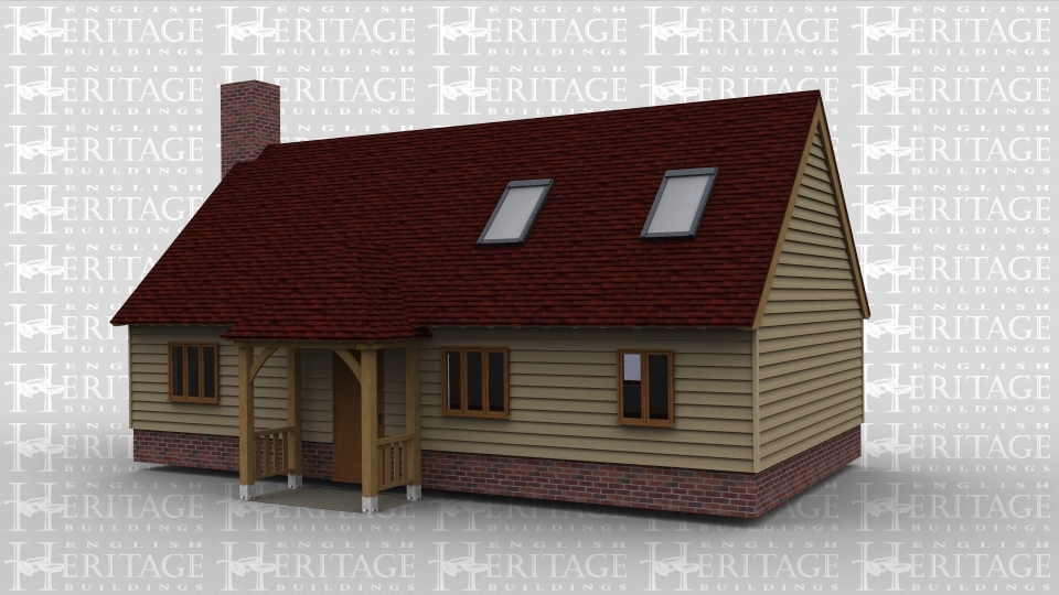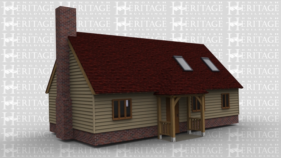 An oak framed single storey house with upper roof space. Ground floor has single windows and a front door with a porch. Upeer space has roof lighting to allow natural light. House is completed with a brick chimmney on one side.