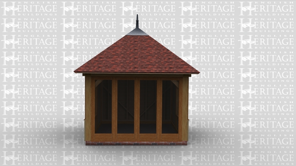 An oak framed garden room / summer house with a leaded finial on the top of the roof. Full height glazing is used on one side of the building, with single windows used on the other two sides.