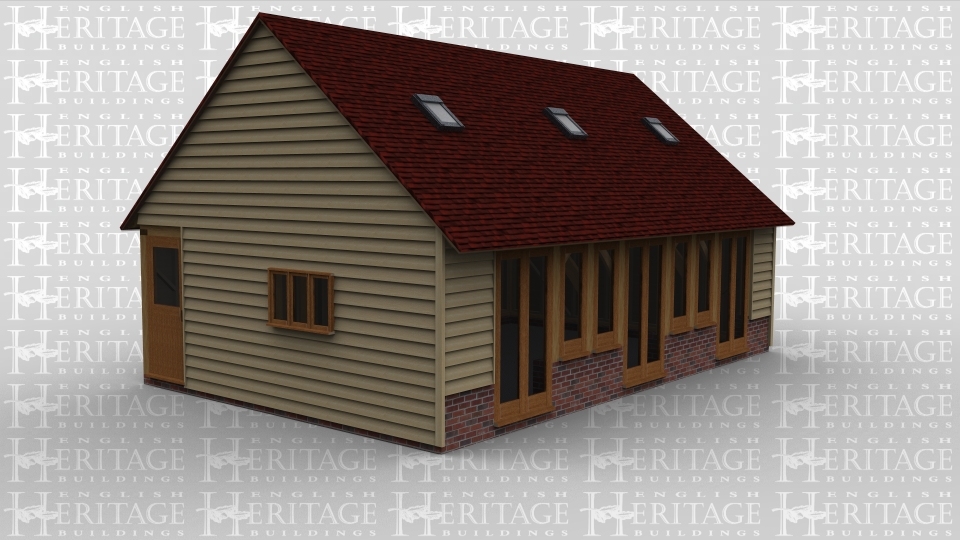 An oak framed pavillion with both full height glazing and single windows. Roof lighting is also used to gain as much natural light as possible.